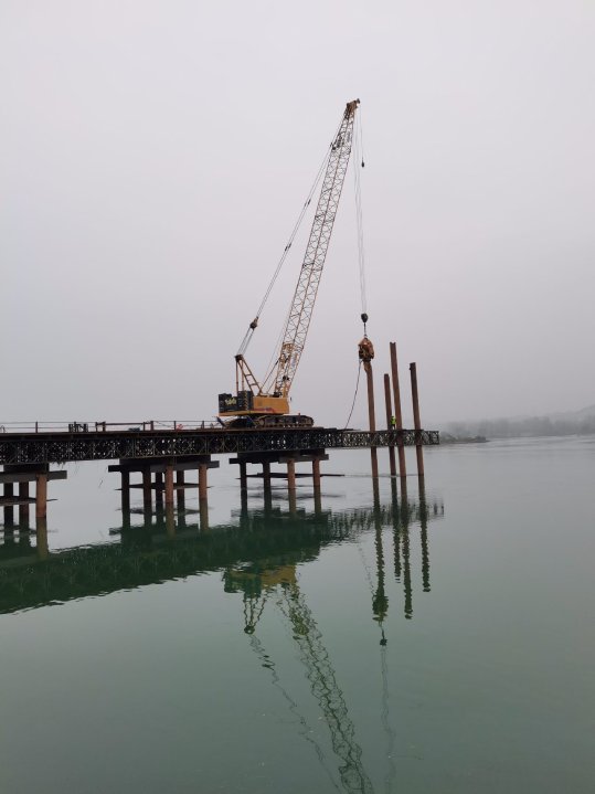 依托丹江口市水都二橋工程,通過(guò)“板凳+局部錨固”鋼管樁抗高流速水情施工技術(shù)、鋼管樁沉樁無(wú)引孔技術(shù)及鋼棧橋快速裝配施工技術(shù)等關(guān)鍵技術(shù),順利完成了鋼棧橋施工。通過(guò)鋼管樁直接振動(dòng)沉樁形成“板凳樁”,提高了棧橋橫向穩(wěn)定性,同時(shí)直接振打鋼管樁沉樁,管內(nèi)無(wú)需澆筑砼,提高了施工效率,降低了施工成本,此外,依次裝配安裝鋼棧橋各類(lèi)裝配構(gòu)件以及裝配式定位導(dǎo)向架,減少了大量現(xiàn)場(chǎng)焊接工作,加快了施工速度,具有較好的推廣應(yīng)用前景。
