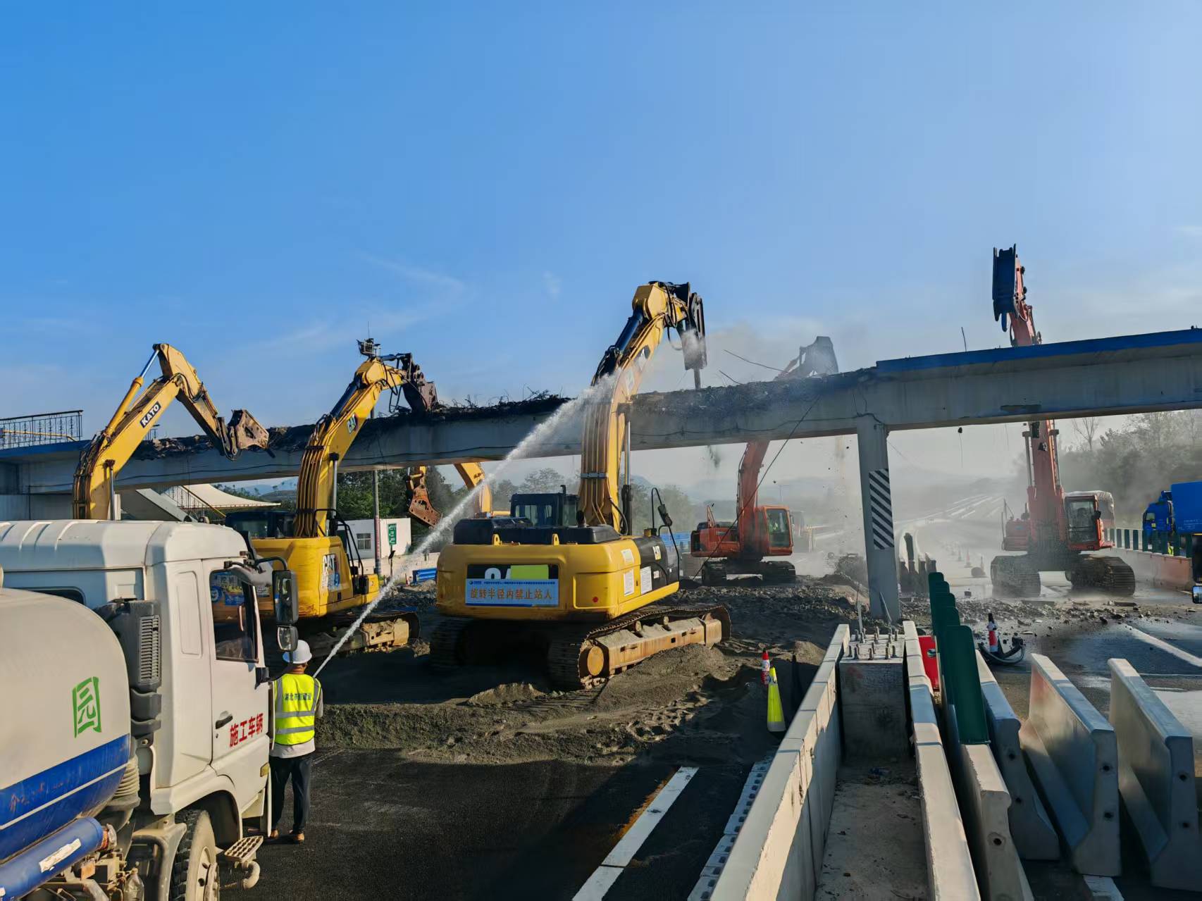 施工環(huán)節(jié)中,團(tuán)隊(duì)結(jié)合原橋結(jié)構(gòu)、地理位置及豐富的現(xiàn)場經(jīng)驗(yàn),采用機(jī)械破碎為主的拆除方案,遵循“先上后下、先中間后兩邊”的原則有序推進(jìn)拆除進(jìn)程。針對不同結(jié)構(gòu)部位靈活運(yùn)用破碎錘破除、挖掘機(jī)拆除和切割吊裝工藝,將梁體轉(zhuǎn)移至地面破碎后,即時(shí)清運(yùn)至線外指定場地。此次應(yīng)急搶險(xiǎn)工程從封閉施工到恢復(fù)通行僅用12小時(shí),以“零事故、零擁堵”的成績兌現(xiàn)了“保安全、保暢通”的攻堅(jiān)承諾。