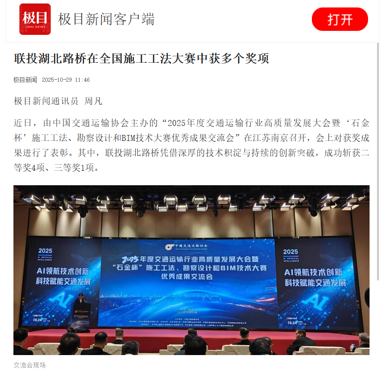 近日,由中國交通運(yùn)輸協(xié)會(huì)主辦的“2025年度交通運(yùn)輸行業(yè)高質(zhì)量發(fā)展大會(huì)暨‘石金杯’施工工法、勘察設(shè)計(jì)和BIM技術(shù)大賽優(yōu)秀成果交流會(huì)”在江蘇南京召開,聯(lián)投湖北路橋榮獲多個(gè)獎(jiǎng)項(xiàng),極目新聞對(duì)此事件進(jìn)行報(bào)道,以下是報(bào)道全文: