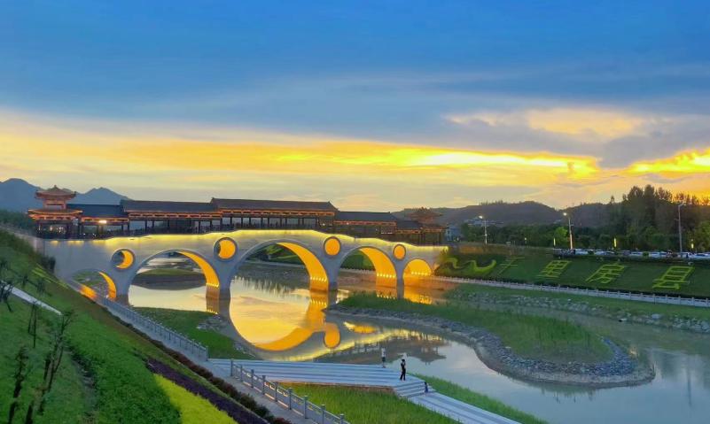 西河拱橋位于老西河拱橋北面,全長106m,采用27+37+27m上承式鋼筋混凝土拱橋結(jié)構(gòu),橋拱采用古風(fēng)古韻的風(fēng)雨廊橋造型,與房縣《詩經(jīng)》文化遙相呼應(yīng)。